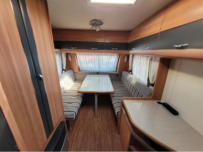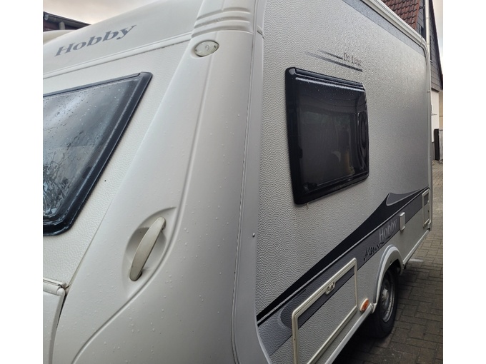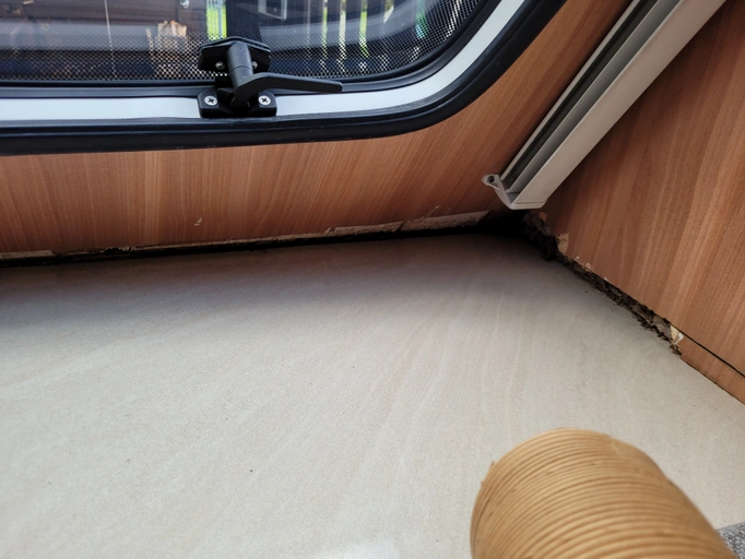 Na velkém okně nad plynovou skříňkou jsme měli vlhkou skvrnu, typickou pro Hobby. Poškození vodou jsme si opravili sami, nikoliv profesionálně (viz foto)