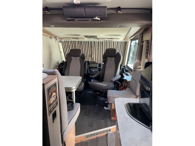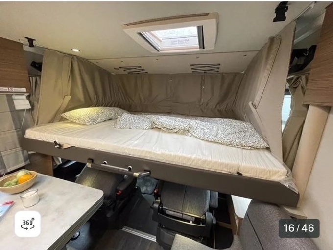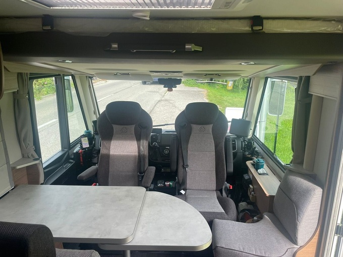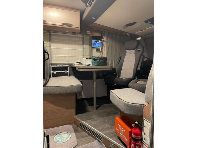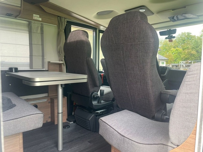 - Jídelní kout s dvoumístnou lavicí, otočným sedadlem řidiče a spolujezdce, 1 x boční sedadlo, stůl s otočnou přídavnou deskou stolu
