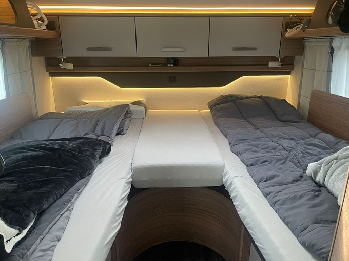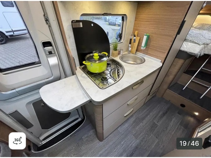 - Kuchyňská linka s plynovou varnou deskou se 3 hořáky, mimořádně velkou chladničkou (177 l) s mrazicím boxem a trojitým automatickým režimem.
