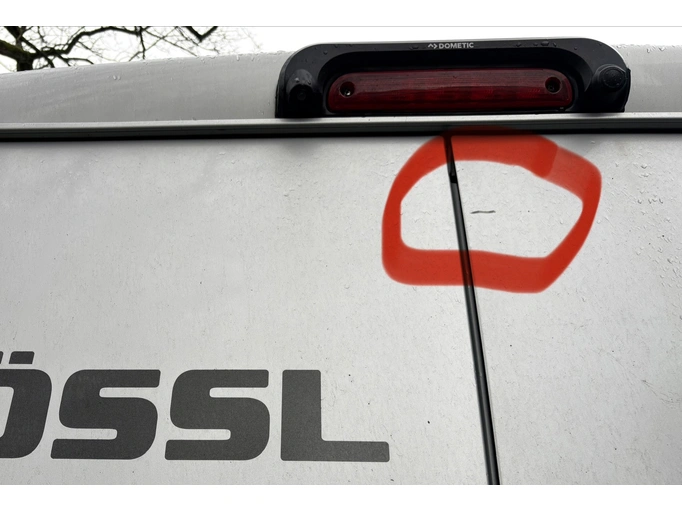 Škrábance na zadních dveřích vpravo (nátěr v pořádku, bez koroze), panel před zadní svítilnou otevřený kvůli výměně zadního blinkru